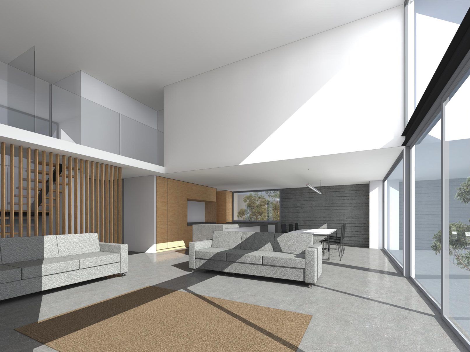 The concept for the Mountain House was to strip back the design to a minimal palette of quality materials and bring them together in a simple but highly articulated and refined manner. The heavy anchored concrete contrasts with the lightweight glazing and aluminium to provide light and shade, warmth and mass, prospect and refuge. Located internally is a double-height void space surrounded by the key functional elements of the house. These rooms spill into the void to provide complete flexibility and functionality.